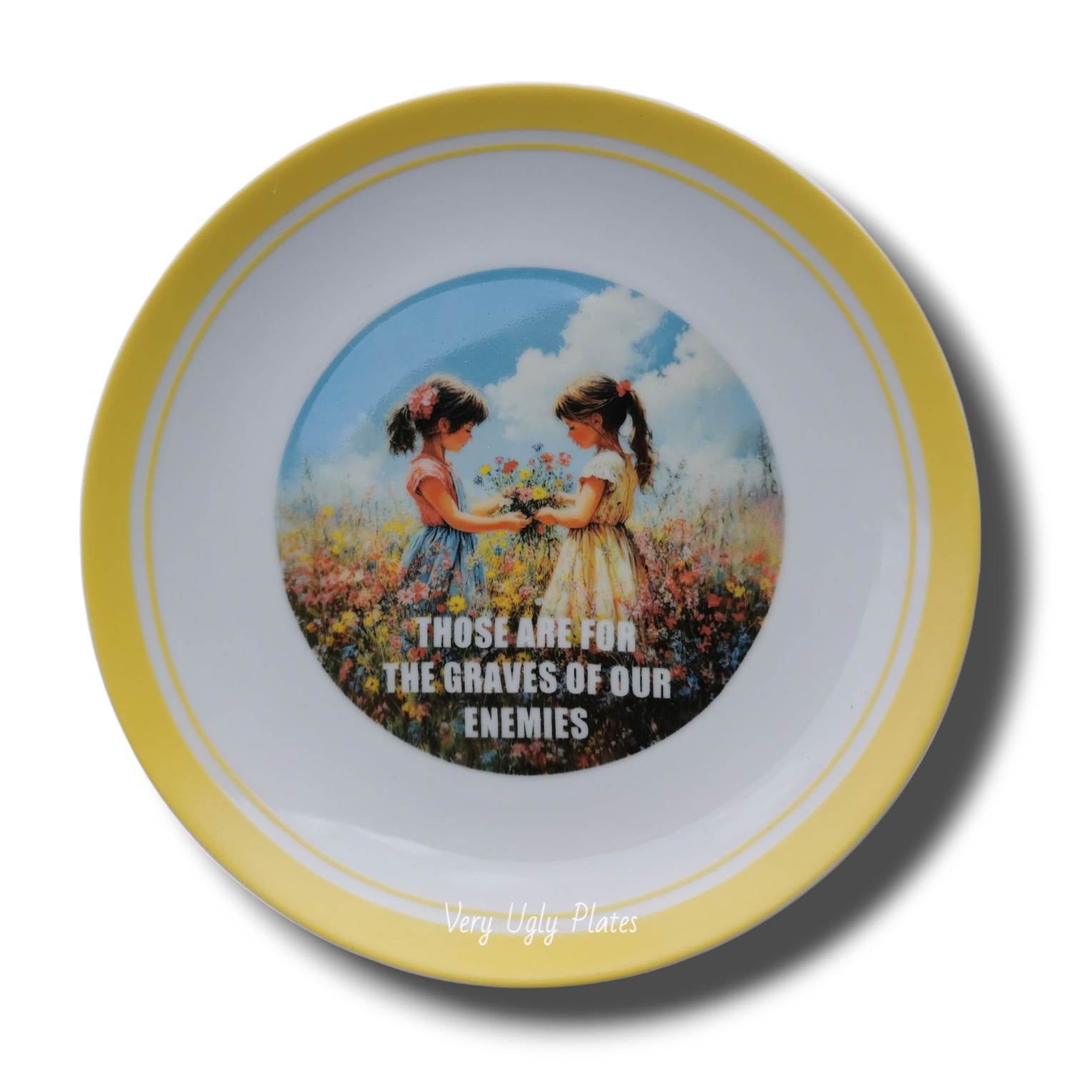 Make your wall decor stand out with this whimsical and edgy 20 cm decorative plate, featuring two sweet girls picking flowers with the bold statement, "Those are for the graves of our enemies." This quirky piece is a perfect blend of innocence and dark humor, making it a memorable and funny birthday present or a unique gift idea for her.