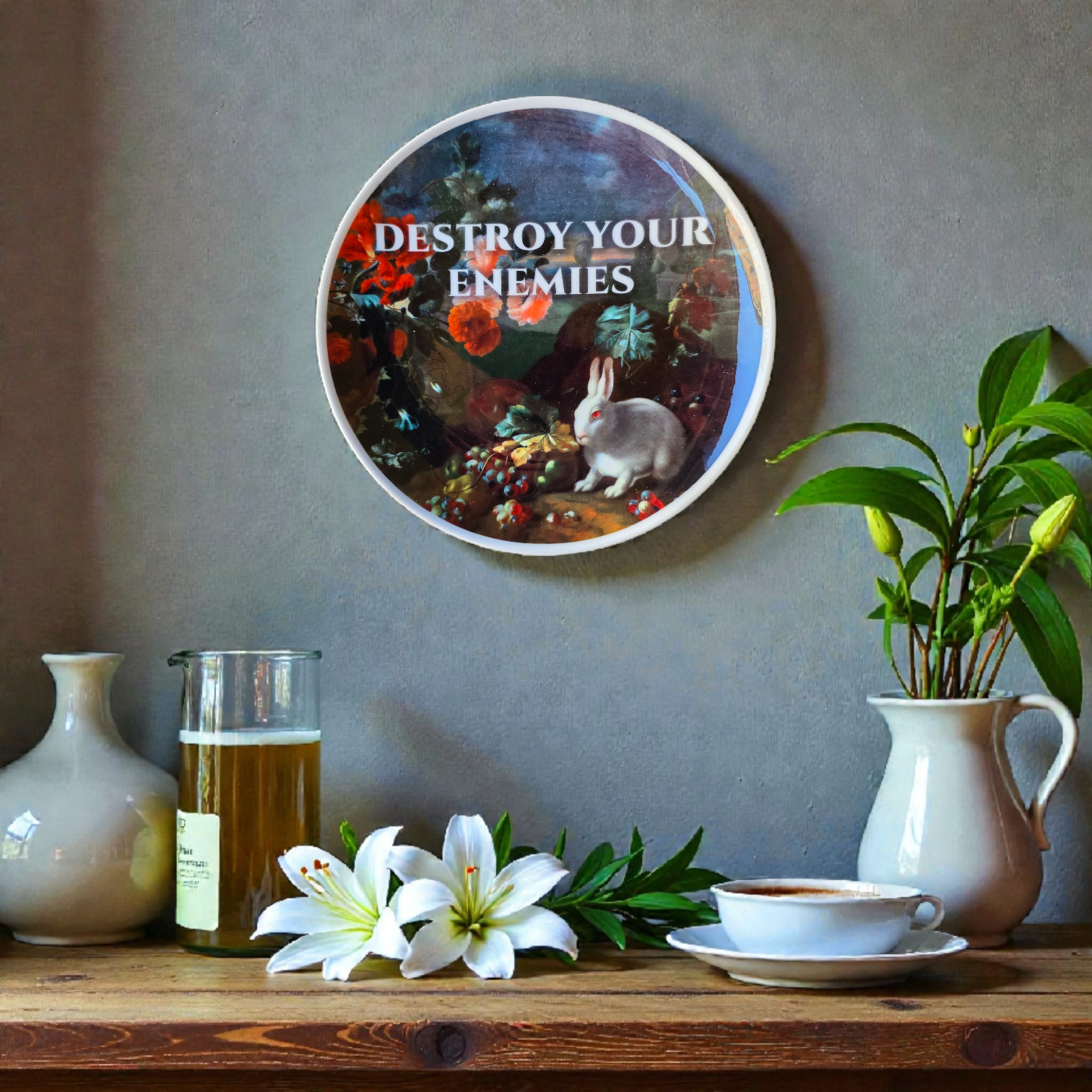 This 20 cm decorative plate features a moody, baroque-style scene with a suspiciously calm rabbit and the empowering life advice we all need: DESTROY YOUR ENEMIES.