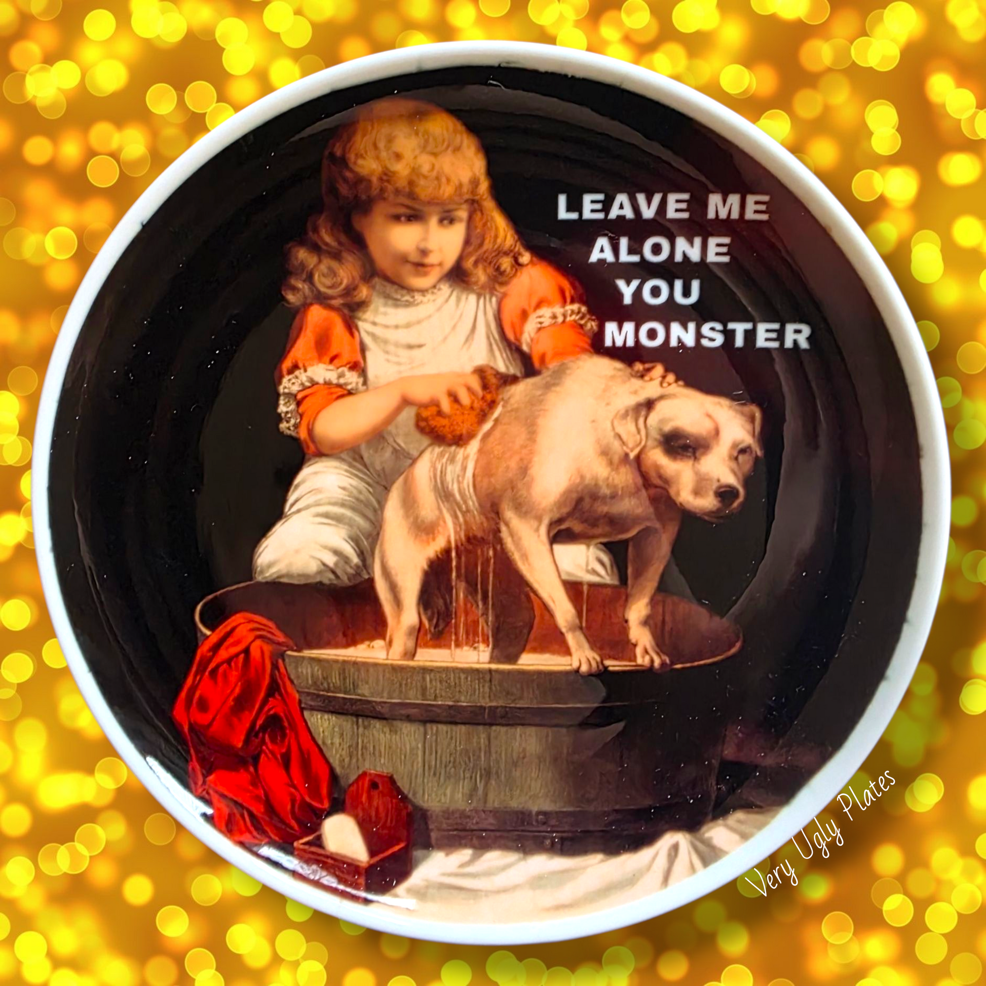 This 21 cm Very Ugly Plates gem features a vintage child lovingly washing a dog who clearly disagrees with the entire situation.