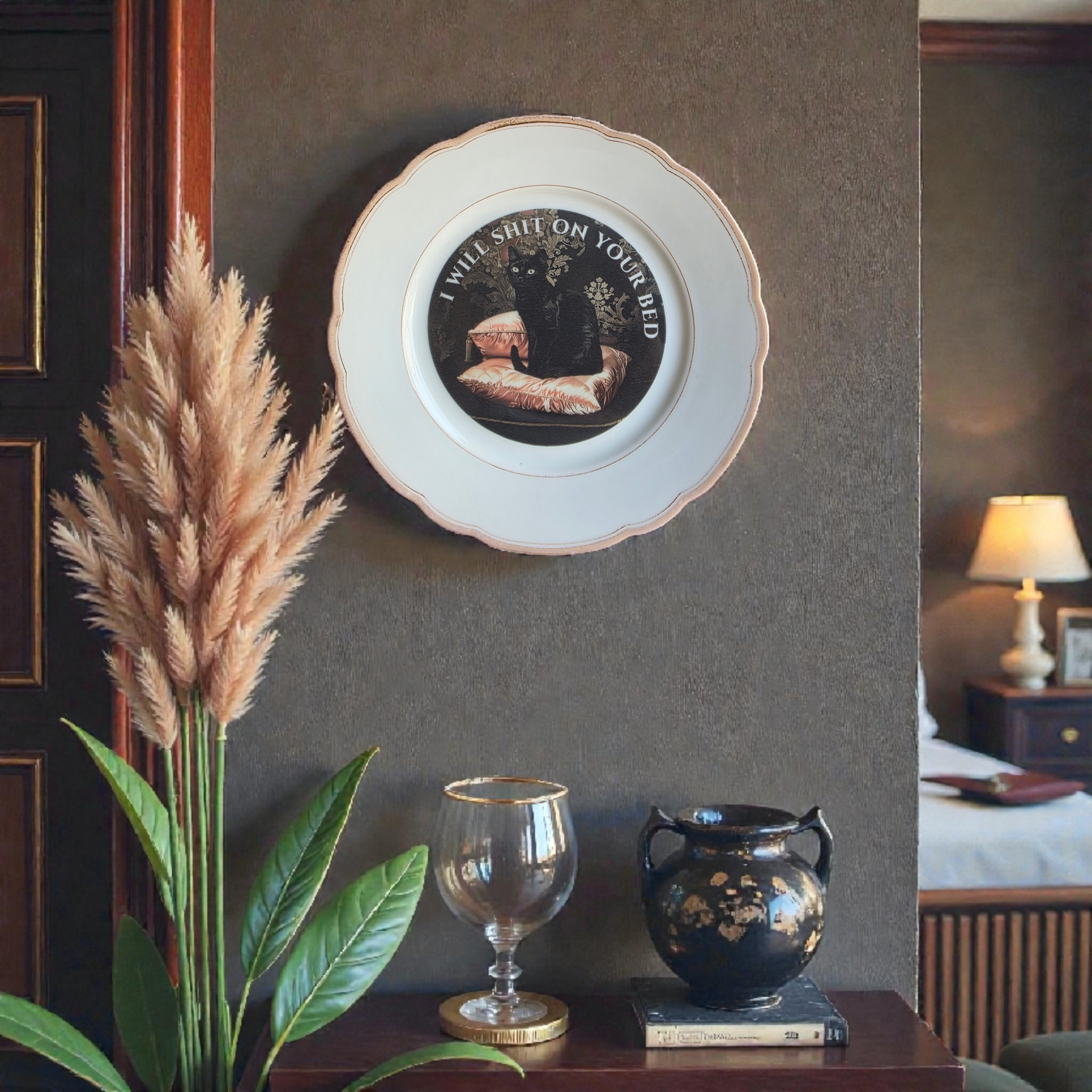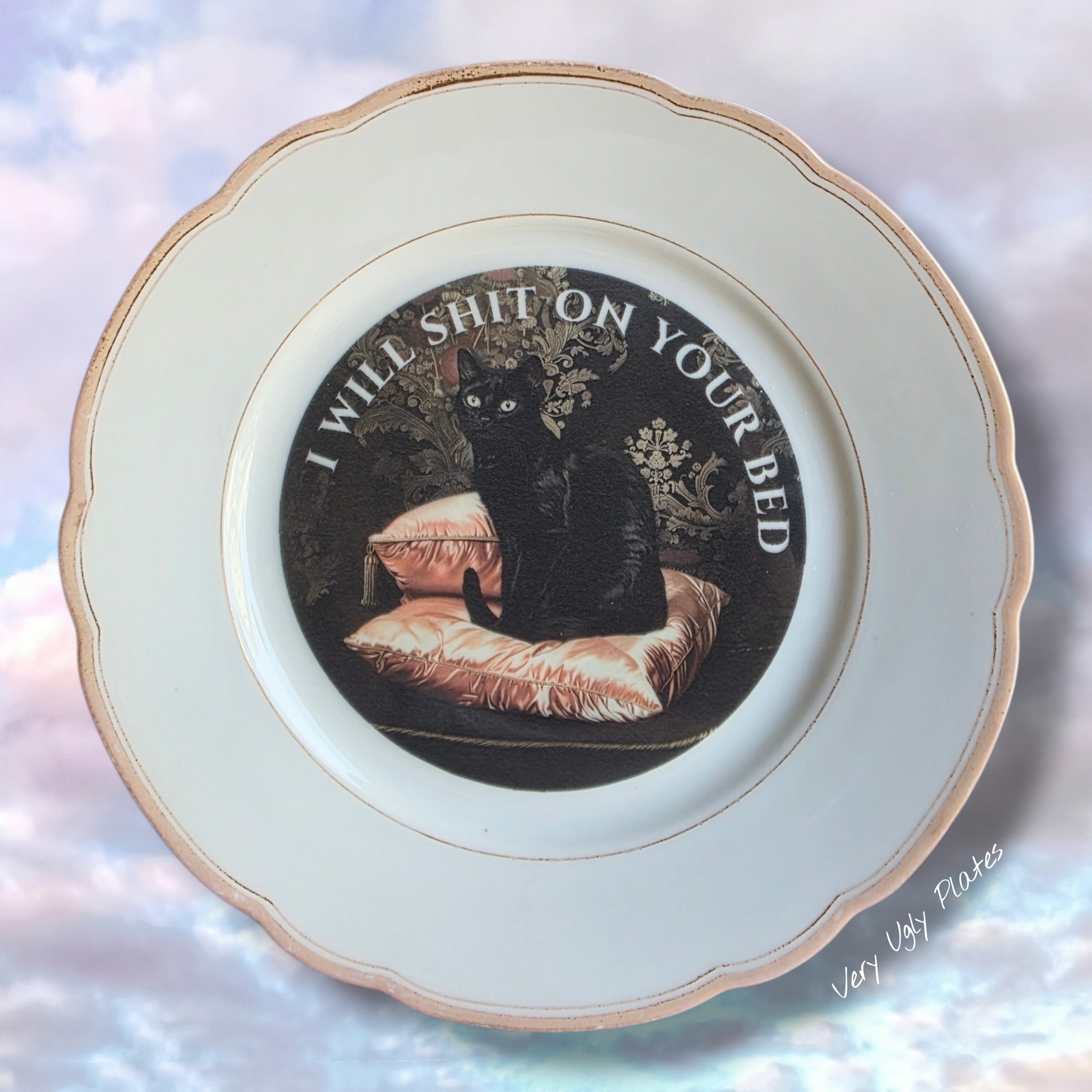 This statement plate features a majestic black cat sitting regally on silk pillows with the bold caption: “I Will Shit On Your Bed.” A perfect mix of baroque elegance and chaotic cat energy. Ideal for cat lovers who appreciate beauty… and boundaries.
