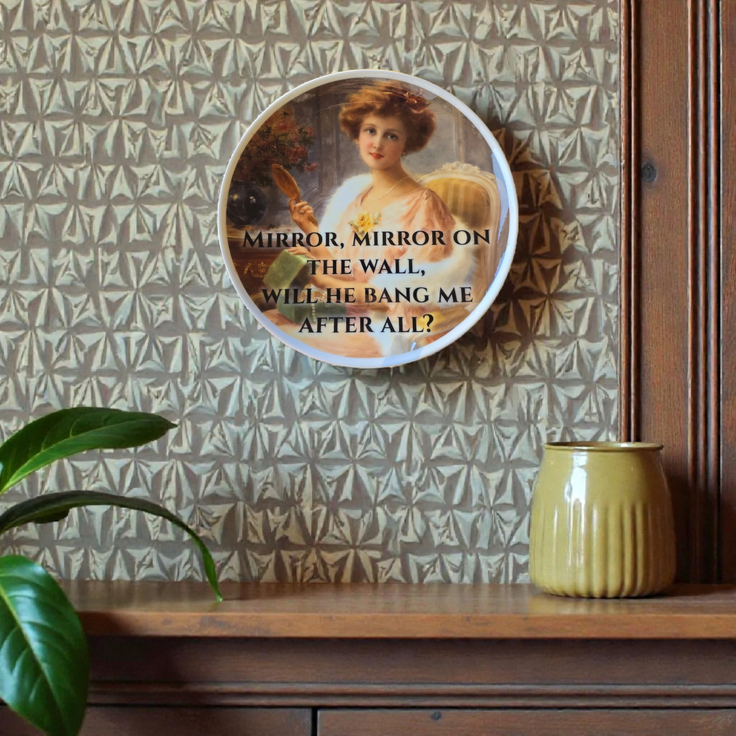 This 20 cm round plate features a romantic, vintage-style portrait paired with a quote that says what the mirror really thinks. Sweet face, bold question, zero shame.