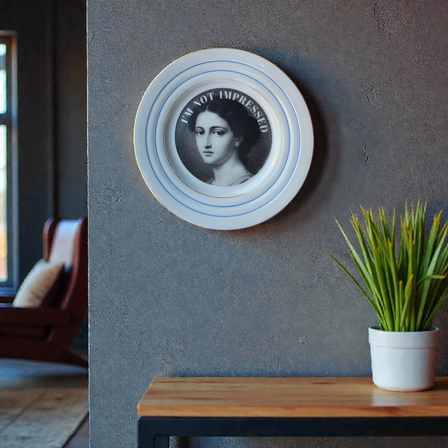 Meet your new favorite passive-aggressive houseguest: this delightfully moody vintage plate featuring a classic portrait of a 19th-century lady serving side-eye stronger than your morning espresso. Surrounded by the timeless phrase “I’M NOT IMPRESSED,” she’s the perfect companion for your kitchen, hallway, office, or anywhere you need a gentle reminder that not everything (or everyone) deserves your enthusiasm.