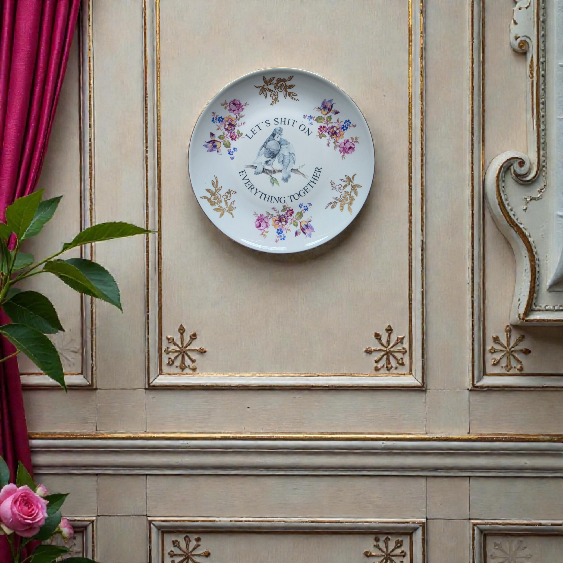 Celebrate love with a humorous twist with this 20 cm decorative plate, featuring two lovebirds and the playful message, "Let's shit on everything together." This food-safe plate is perfect for serving up a side of laughter or displaying as a quirky piece of art in your home. Ideal as a unique wedding gift or a funny romantic gesture, it’s sure to make an impression.